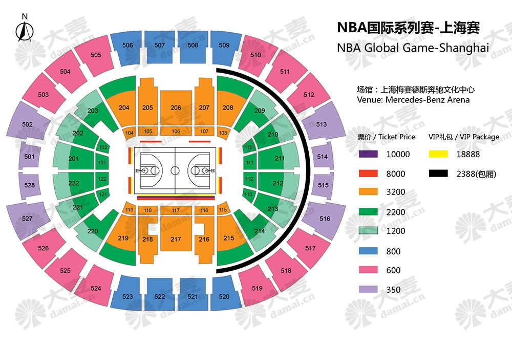 The arena can be set up in many configurations and you should enquire with the event organiser for seating and rates. Here is an example seating guide from an NBA event (prices in RMB).